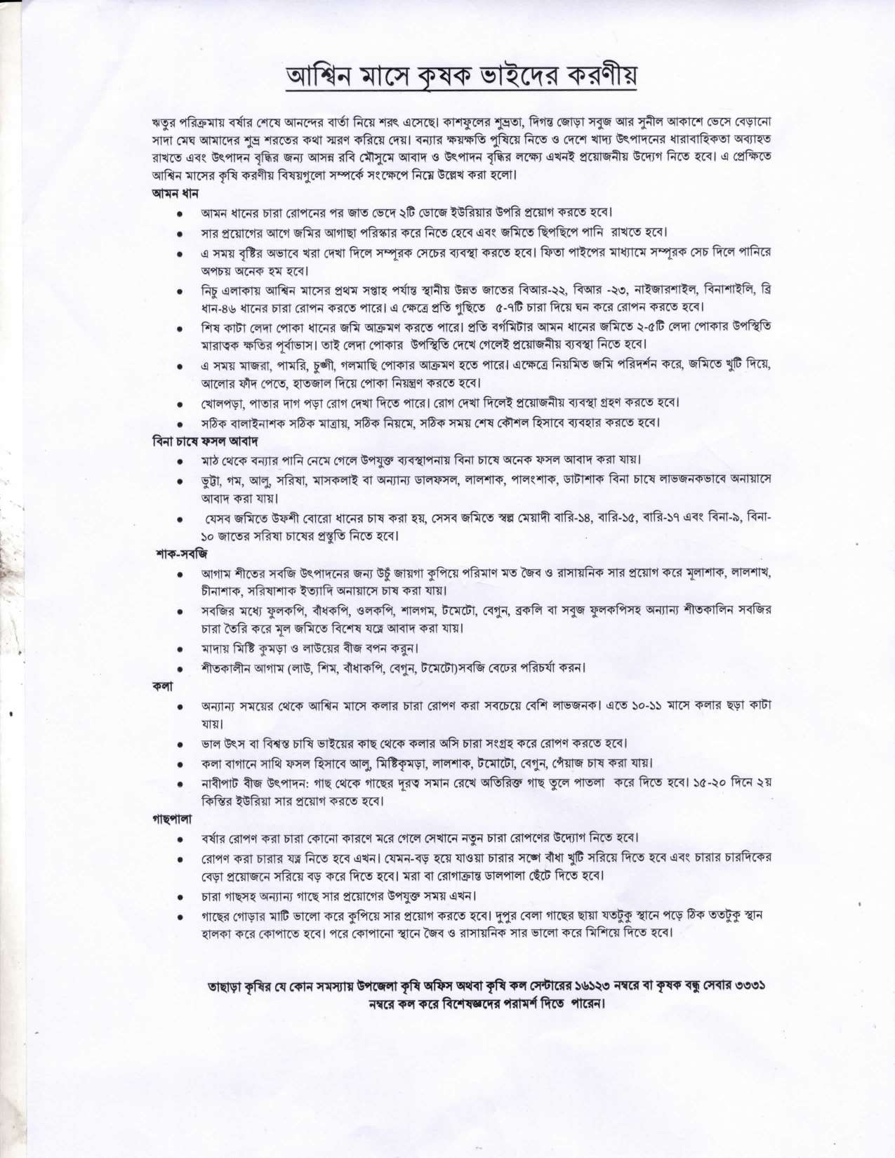 আশ্বিন মাসে কৃষকদের করণীয়